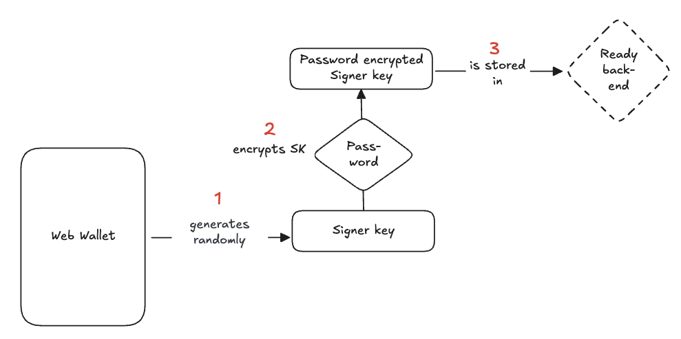 When a user creates a new Web Wallet account, a signer key is randomly generated, encrypted by the user’s password, and securely stored in Ready's backend.
